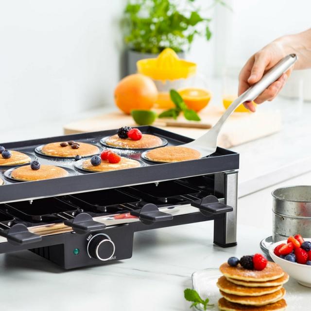 La raclette est synonyme de convivialité et de partage. Notre appareil est conçu pour accueillir plusieurs personnes autour de la table, offrant des compartiments individuels pour faire fondre le fromage et une surface de cuisson spacieuse. Contrôlez la chaleur selon vos préférences grâce à un thermostat réglable. Ajustez la température pour la texture parfaite de votre fondu au fromage ou pour griller vos ingrédients selon vos souhaits. Matière : Inox Couleur : Noir Longueur : 60 cm Largeur : 31.5 cm Hauteur : 19 cm Compatible Lave-vaisselle